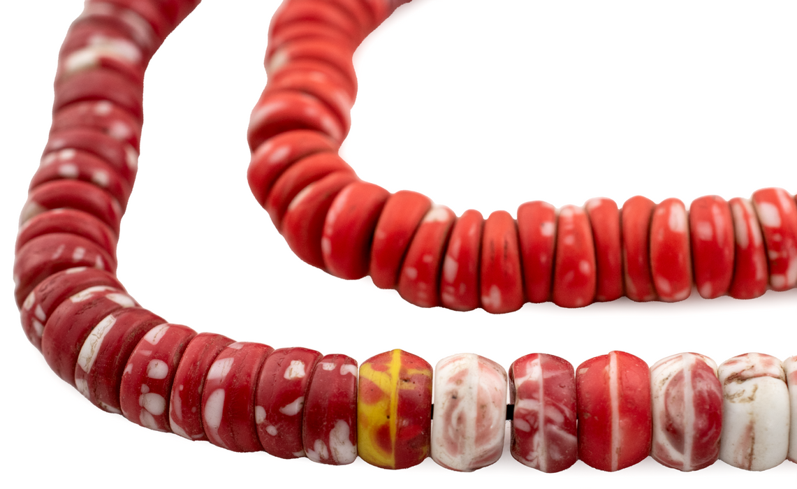 The unique look of Kakamba beads is easily recognized among the beads of Africa. Originally produced in former Czechoslovakia, these beads are made using a special process whereby glass is pressed in a mold. Also known as Prosser beads, these fun vintage African trade beads come in a variety of different colors and combinations. Each strand is unique. You will receive the exact strand shown in the photo. Bead and strand dimensions are approximate and may vary slightly. Get yours today!