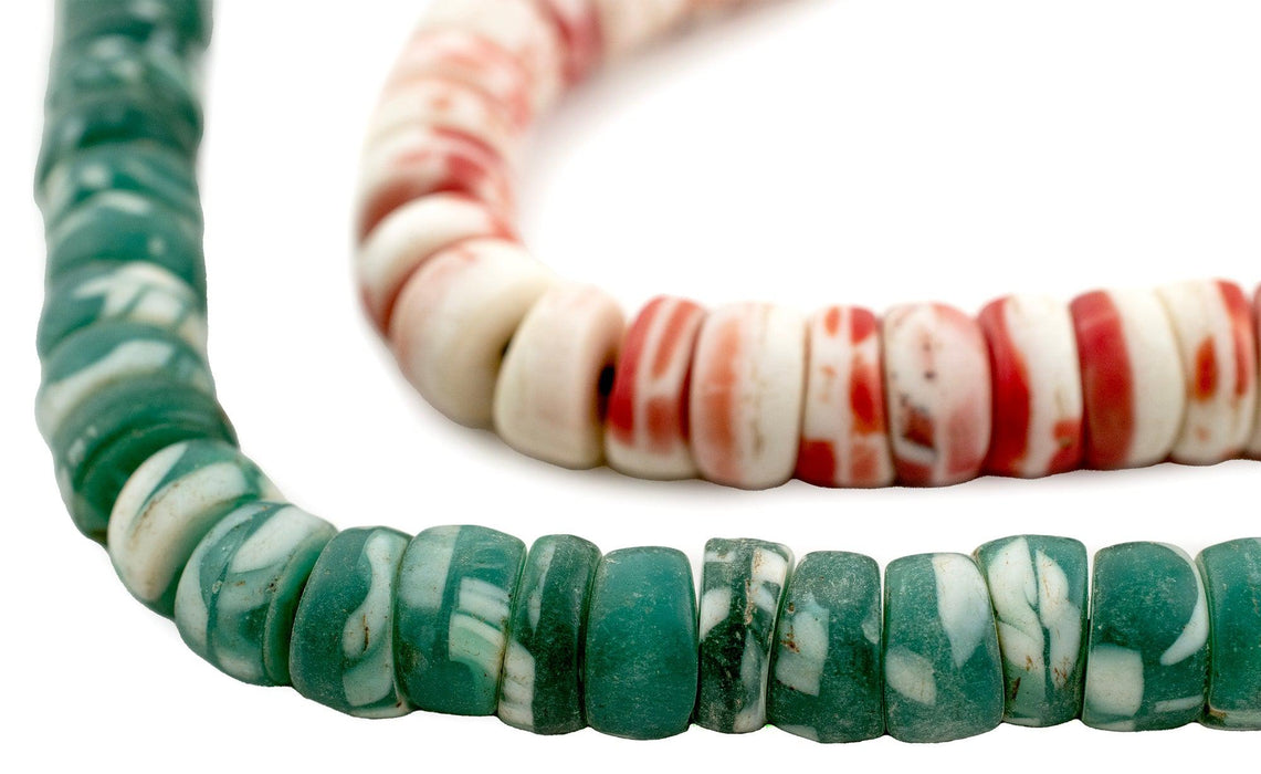 The unique look of kakamba beads is easily recognized among the beads of Africa. Originally produced in former Czechoslovakia, these beads are made using a special process whereby glass is pressed in a mold. Also known as prosser beads, these fun vintage African trade beads come in a variety of different colors and combinations. Each strand is unique. You will receive the exact strand shown in the photo. Bead and strand dimensions are approximate and may vary slightly. Get yours today!