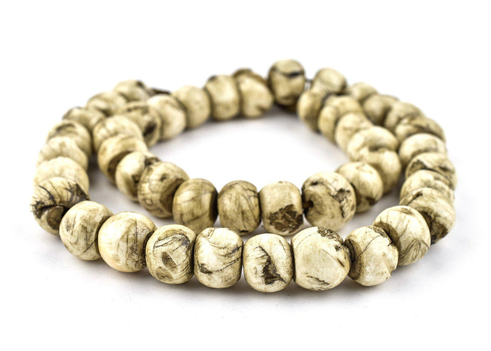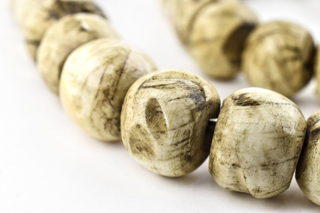 Longer strand of Naga Shell beads. Each bead strand measures between 23-27'' in length. Our stock has some variation in size with beads measuring 11-16mm wide by 16-18mm diameter and has a 1mm hole size. These beads may be used in custom jewelry designs nor since they are nicely strung, may be worn as is. Long length of the strand would also make them suitable for draping as an accessory in your favorite room. The beads have a rustic character and are made from natural material with imperfections. Each strand is unique and may vary from strand pictured.