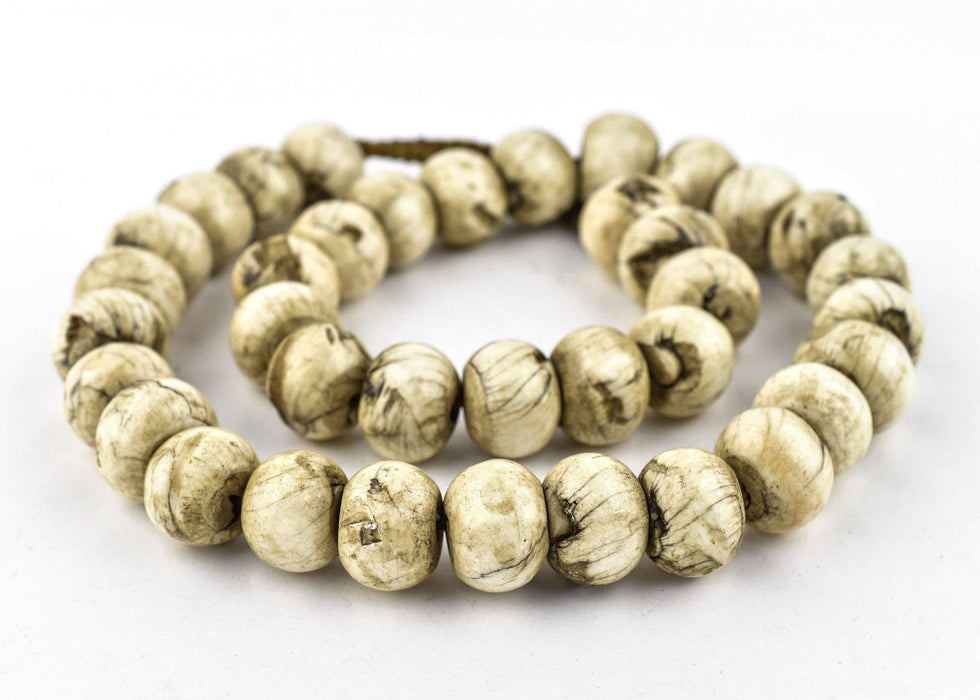 Admire the detail of these unusual beads fashioned in a round-like shape from the natural shell of the ocean conch. The material for these unique beads is said to have been traded from the Bay of Bengal north towards the Himalayan mountains. No two beads are alike however beads measure approximately 16mm wide by 22mm diameter with hole size of 1mm. The length of strand measures about 28". Each strand is unique and may vary slightly from photo. Beads may be used in your own special jewelry design however the beads have been nicely strung and the strand may also easily be worn as a necklace or used for home decor. Note that due to the weight of these beads, a shipping surcharge may apply for some international orders.