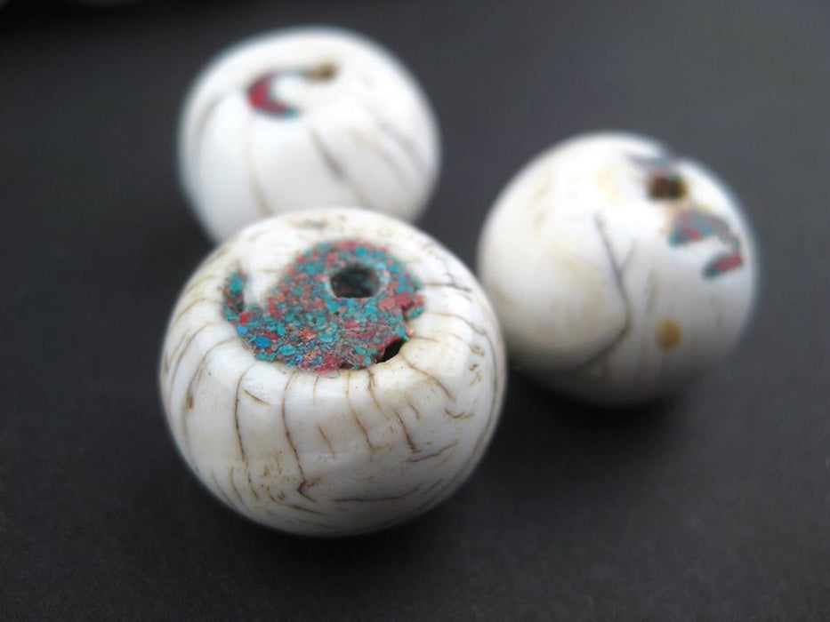 Turquoise and Coral-Inlaid Tibetan Shell Beads (14x17mm)