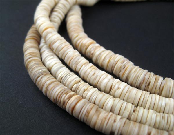 Checkout these beautiful vintage seashell beads from west Africa! Unlike typical seashell beads, these beads have an older look with a more rustic character. These beads are strung on sisal and could even be worn as is. The strand is approximately 25" long, and each bead is about 5-6mm in diameter. These beads will add a unique touch to you beaded jewelry. Each strand is unique and may vary slightly from photo. Two strands are shown in the photo. You will receive one full strand.