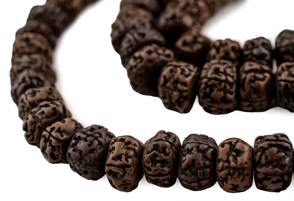 Take a moment to appreciate these stunning Vintage-Style Rudraksha Prayer Beads. These beautiful Mala Beads are made from natural plant seeds and come to us all the way from the highlands of Nepal. These Prayer Beads are a great size for home decorating projects and adornments or could be worn doubled as a large statement piece. Each artisan bead strand is about 48" in length with individual beads measuring approximately 10-13 x 13-18mm and roughly has a 2-3mm bead stringing hole. The shade of the beads may vary slightly in tone from strand to strand. Quality must be felt to be appreciated.