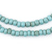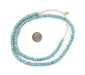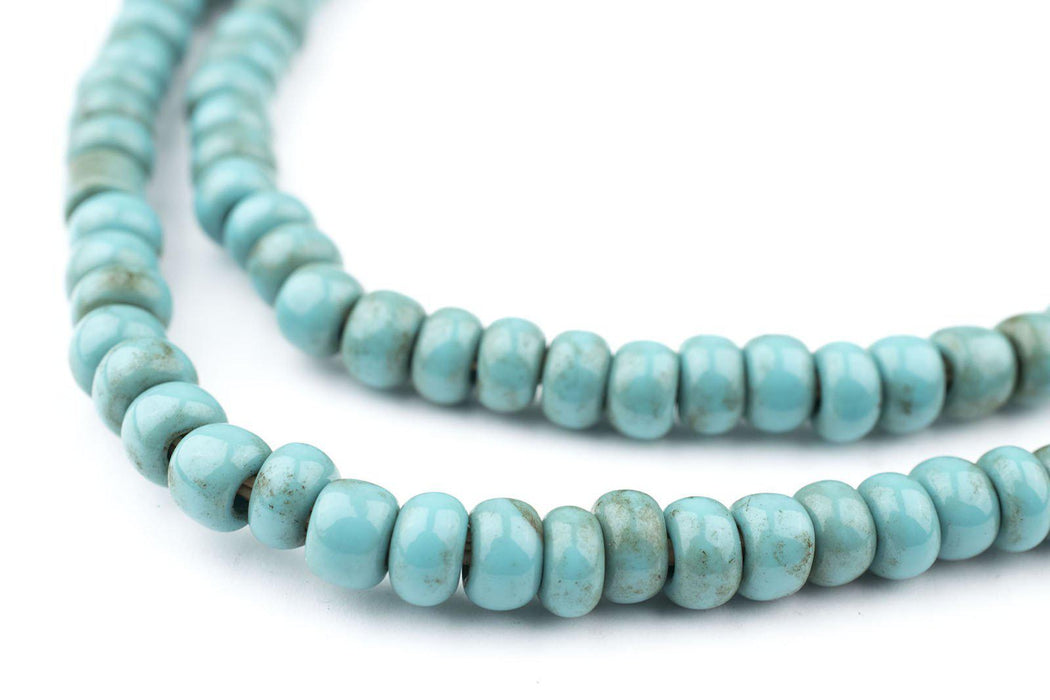 This beautiful strand of Ghana glass beads was produced to resemble vintage turquoise gemstone. Each bead measures approximately 3-5 x 6mm, with hole size of 2mm. Strands measure approximately 24 inches in length. Unique find!