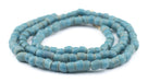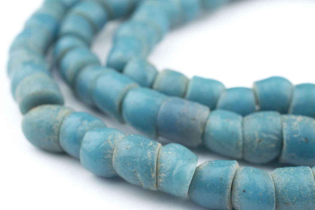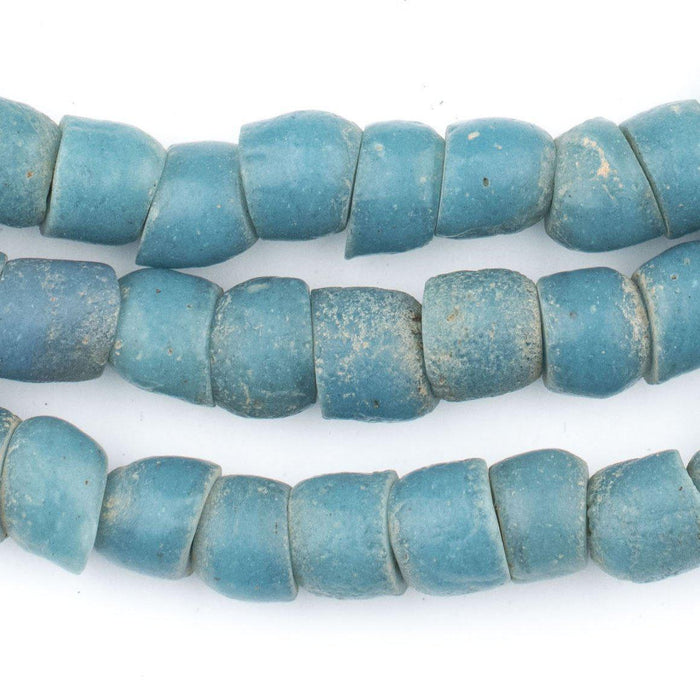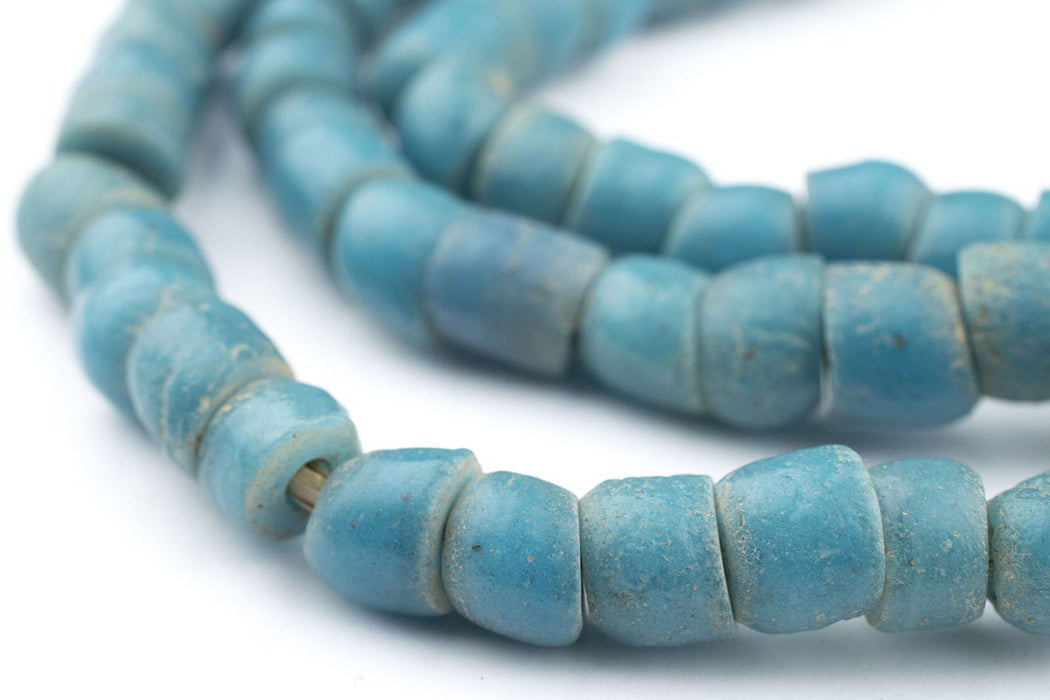 This beautiful strand of African glass beads comes in a rare turquoise-teal color. Different from modern-day Ghanaian glass beads, these special beads show their age through the smoothness of their texture. Each bead measures approximately 7-9 x 8-10mm, with hole size of 3mm. Some beads on the strand may be smaller. Strands are approximately 26" long. These beads are becoming harder and harder to find. Get yours while you can.