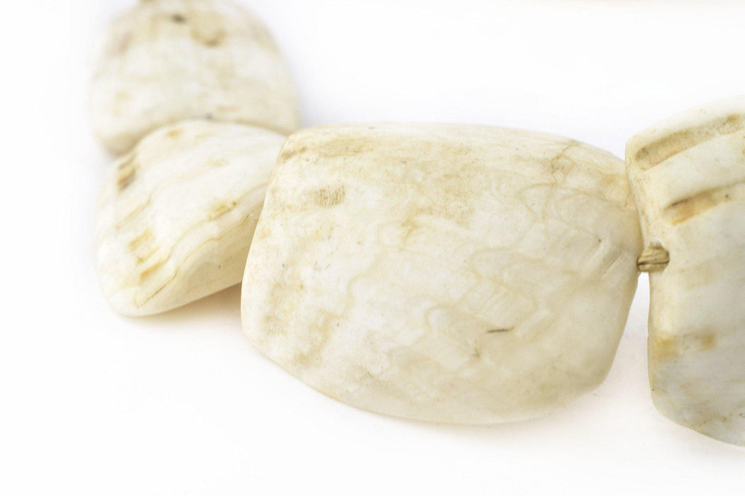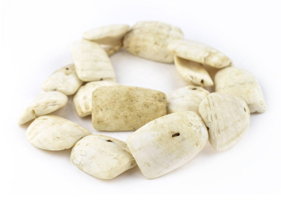 Admire these beautiful natural beads referred to amongst African traders as "Hippo teeth." While made of natural shell, these beads are called hippo teeth due to their resemblance to the teeth of a hippopotamus. Each strand is unique, therefore the strand you receive may vary from the photo however it will be similar. Beads range in size and are approximately 31-59 x 15-45mm. Current stock is slightly longer strand than pictured. Great as an interior decor piece for your home, or incorporated into your unique and creative jewelry designs!