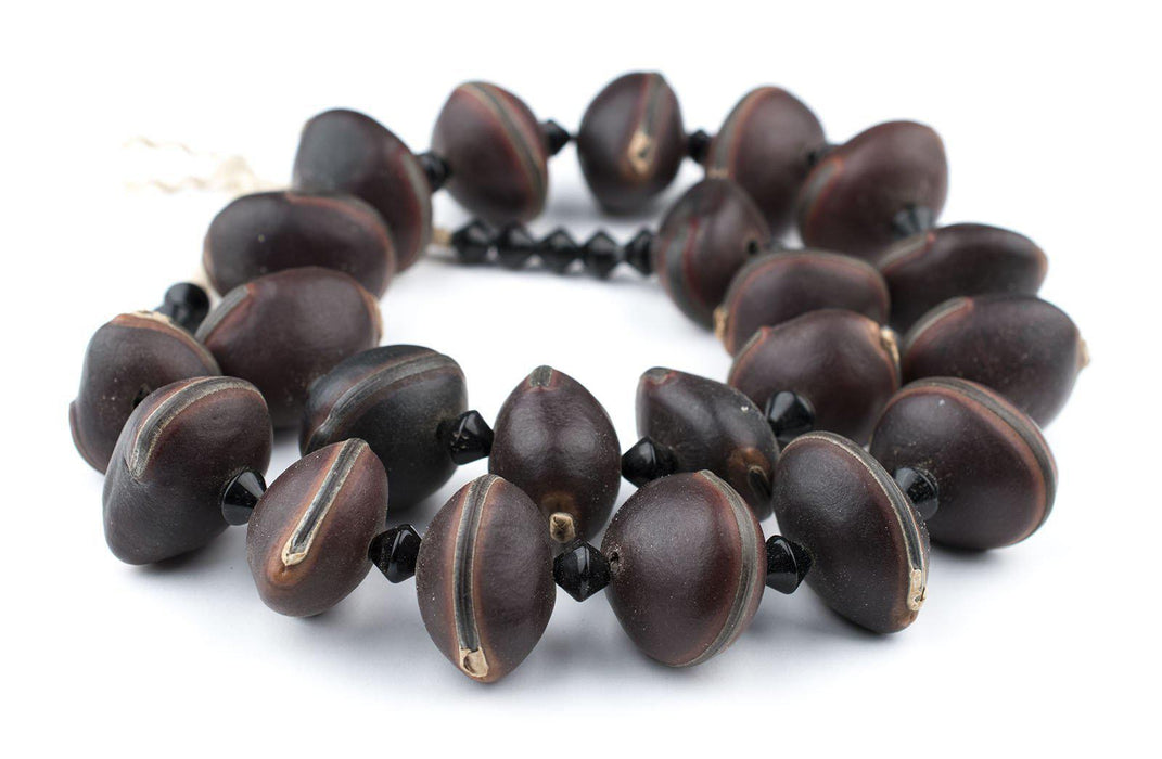 These fun beads are made by drilling the natural seed of an African plant. Each bead resembles a pod with a black stripe running it's perimeter. The beads have been nicely strung with black spacers and could be as a necklace, repurposed in your own designs, or even draped as an accessory on a favorite table. Each bead measures 18-21mm wide and 27-33mm in diameter. There are approximately 22 beads on each strand.