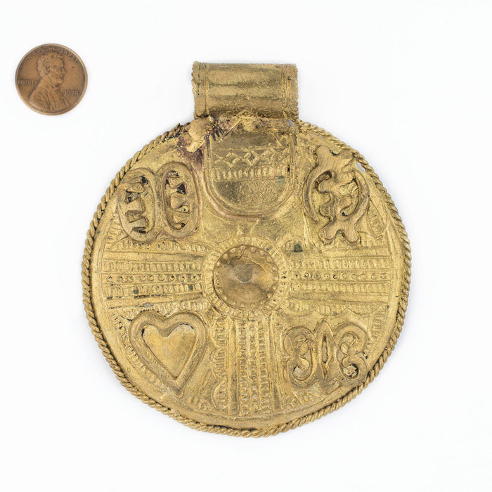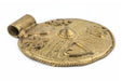 Take a moment to appreciate the fine details of these Large Brass Circle Pendants. These Brass Pendants are handcrafted by master artisans and have a striking uniqueness to them. These large Brass Pendants make for a lovely centerpiece on necklace designs and also look fabulous when worn as is with a simple brass necklace chain. Each Brass Circle Pendant is approximately 96 x 85mm and roughly has a 12mm stringing hole. Each pendant is sold individually. Each pendant is distinctive in its own way and may vary slightly from the picture. Symbols on the shield may vary from photo. Get yours today!