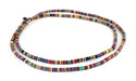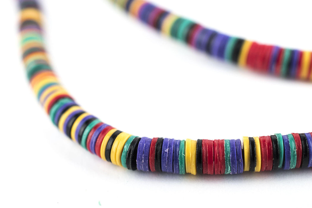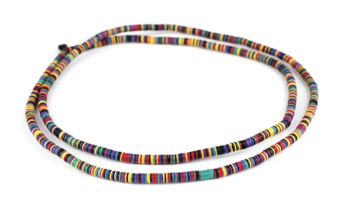 Take a look at this beautiful strand of African vinyl beads in a whimsical rainbow mix of colors. Beads such as these are found in Ghana and Nigeria where they are sometimes worn as waist beads. Older versions of vinyl beads were said to be made from recycled phonograph records. This strand measures approximately 33'' long with individual beads measuring 1 x 4mm. These beads are light and fun to wear and also versatile for jewelry designs. Each strand is sold individually.