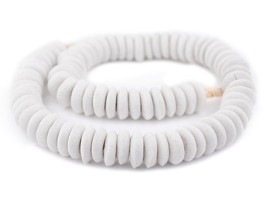 Checkout this beautiful strand of white Ashanti glass saucer beads. The process of making these beads is unique to Africa and has been used for over 1000 years. Pulverized glass of various colors is poured into a clay mold, using a cassava stem for the bead's hole. The mold is placed in a furnace and heated until the glass particles congeal without actually melting and the stem burns out. The Ghanaians have been making beads in this manner since the 1600s. Each bead measures approximately 6-7 x 18-19mm with a hole size of approximately 3-4mm. You will receive a full strand measuring approximately 26". Get yours today!