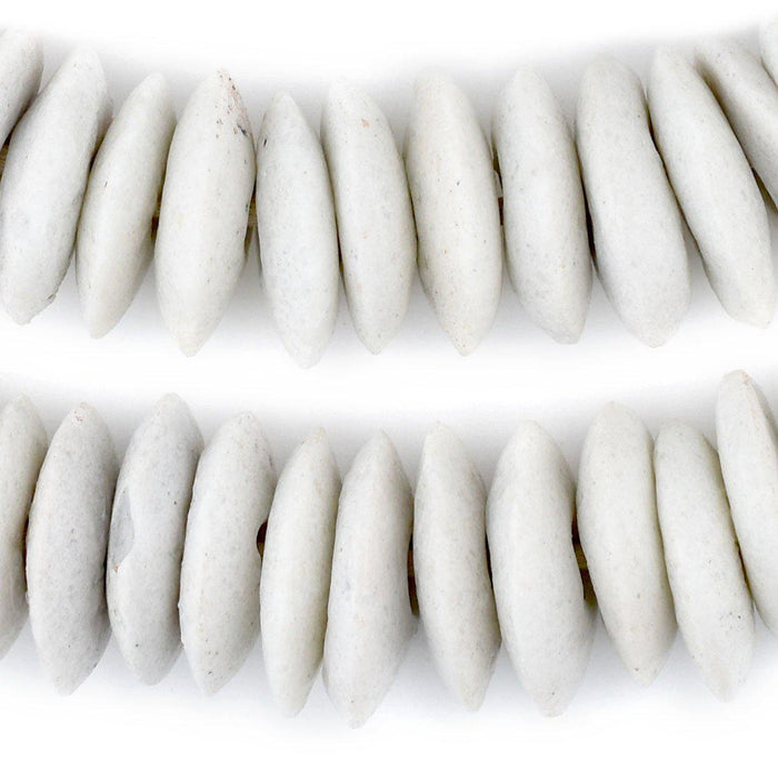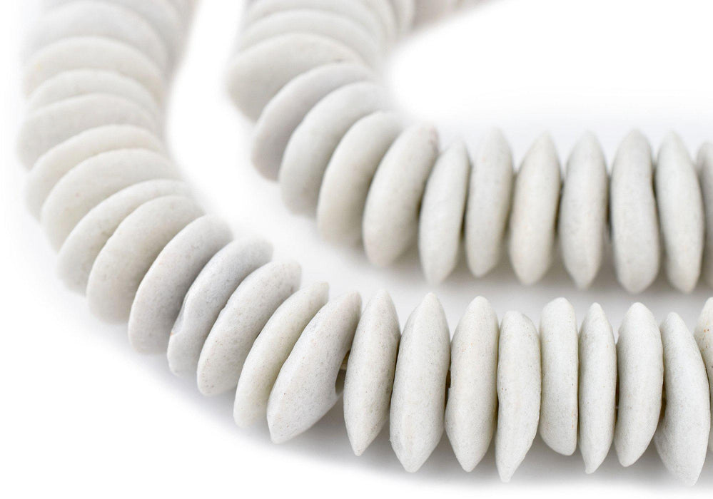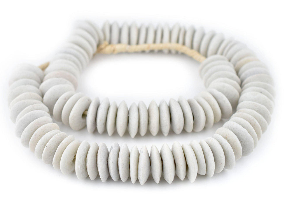 Checkout this beautiful strand of white color Ashanti glass saucer beads. The process of making these beads is unique to Africa and has been used for over 1000 years. Pulverized glass of various colors is poured into a clay mold, using a cassava stem for the bead's hole. The mold is placed in a furnace and heated until the glass particles congeal without actually melting and the stem burns out. The Ghanaians have been making beads in this manner since the 1600s. Each bead measures approximately 5-7 x 20-23mm. Get yours today!