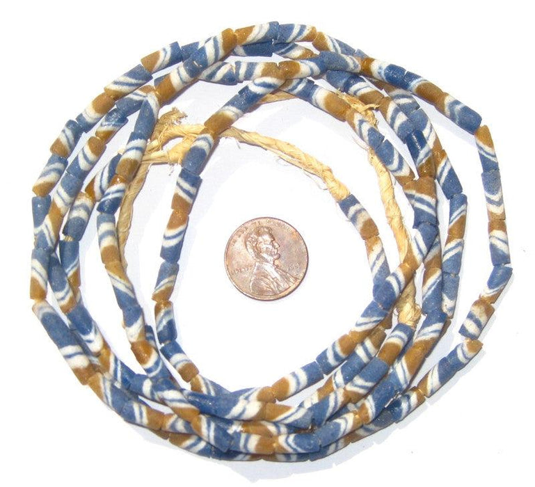 Checkout this beautiful strand of blue and brown African sandcast. These beads were produced by members of the Ashanti tribe in Africa. The process of making these beads is unique to Africa and has been used for over 1000 years. Pulverized glass of various colors is poured into a clay mold, using a cassava stem for the bead's hole. The mold is placed in a furnace and heated until the glass particles congeal without actually melting and the stem burns out. The Ghananians have been making beads in this manner since the 1600s.