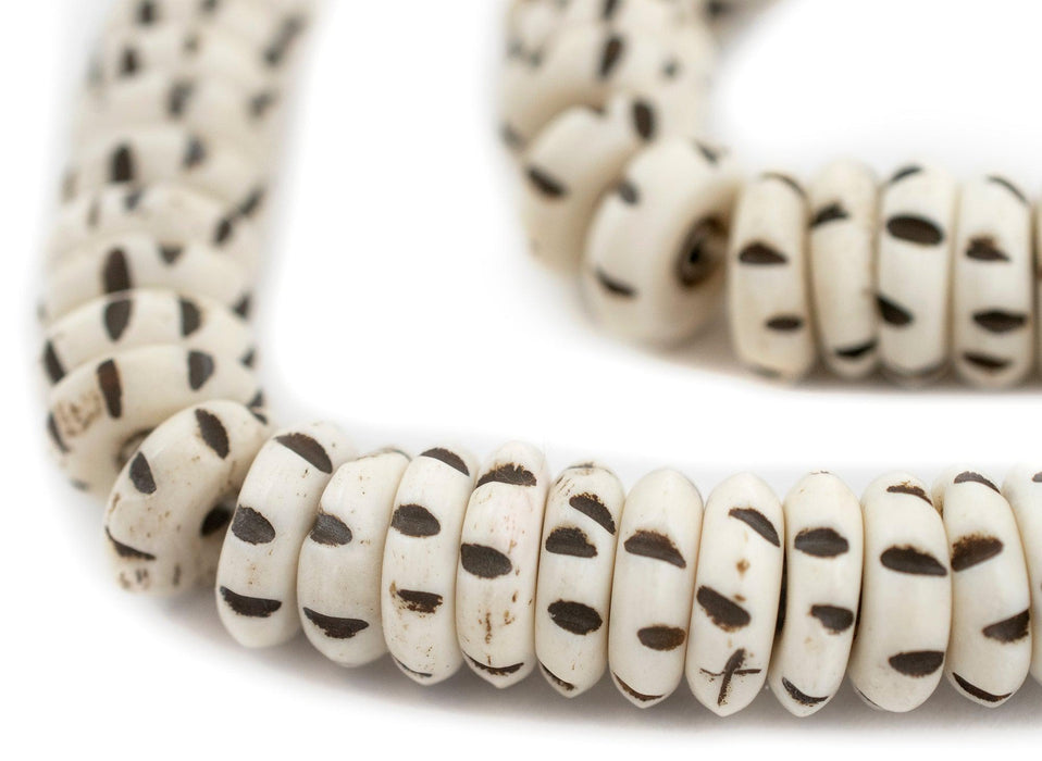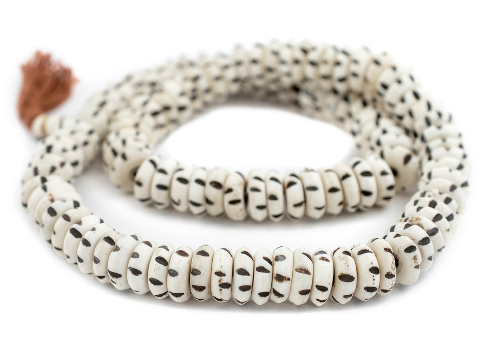Take a look at this beautiful strand of bone Mala beads fashioned in a special disk shape. Each of these bone beads was hand carved out of reclaimed cow bone in the mountainous regions of Nepal. Beads measure approximately 4 x 14mm in size, with a hole size of 2mm. Carving and string color may vary slightly from strand to strand. Can be used as strung in Mala form, or re-purposed into your own jewelry creations.