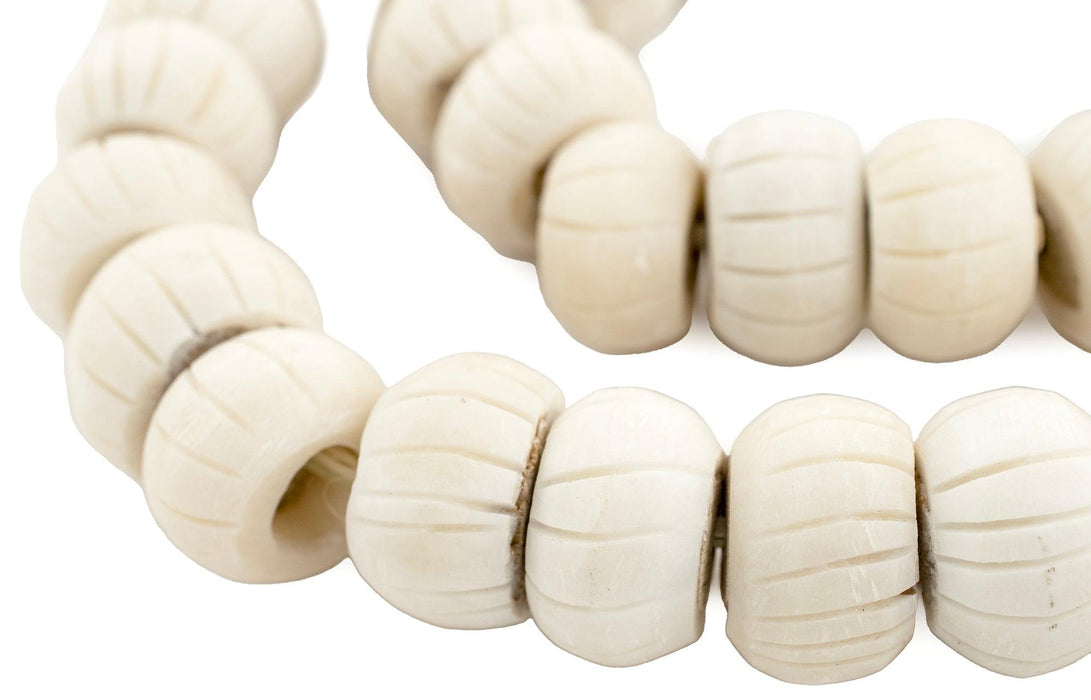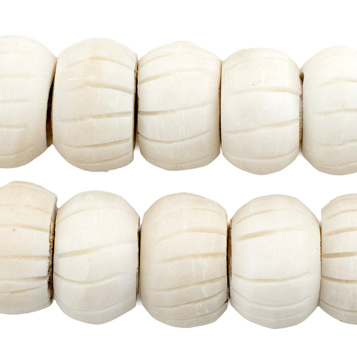 These Carved Watermelon Bone Beads from Kenya will make a beautiful addition to any bead collection. Featuring a minimalist carved design, each bead is individually crafted from durable natural bone. The large rounded shape of each Watermelon style bead complements the intricate detailing. Individual beads measure approximately 15-16 x 23mm with a hole size of about 3mm. You will receive one full strand measuring about 27" in length. These artisan bone beads are sure to be a great addition to any jewelry design kit or decorating project.