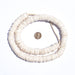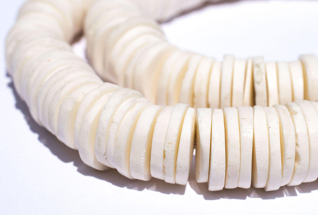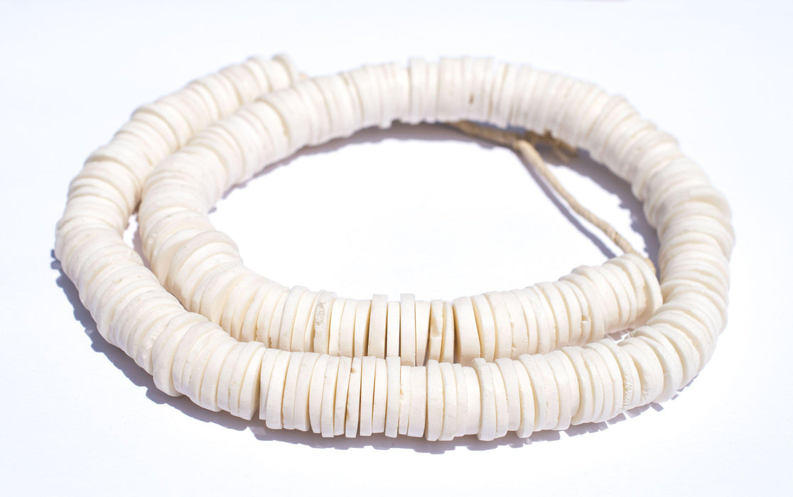 These white bone heishi beads are designed in the spirit of traditional Nigerian coconut heishi. While these beads seem nearly identical in shape to their wooden coconut counterparts, don't be fooled, they are made of authentic recycled bone. These beads are more durable and a bit heavier than the traditional coconut beads. Each bead measures approximately 4mm wide by 16-17mm in diameter, with a hole size of 2mm. Strand length is approximately 27". Truly an unusual find!