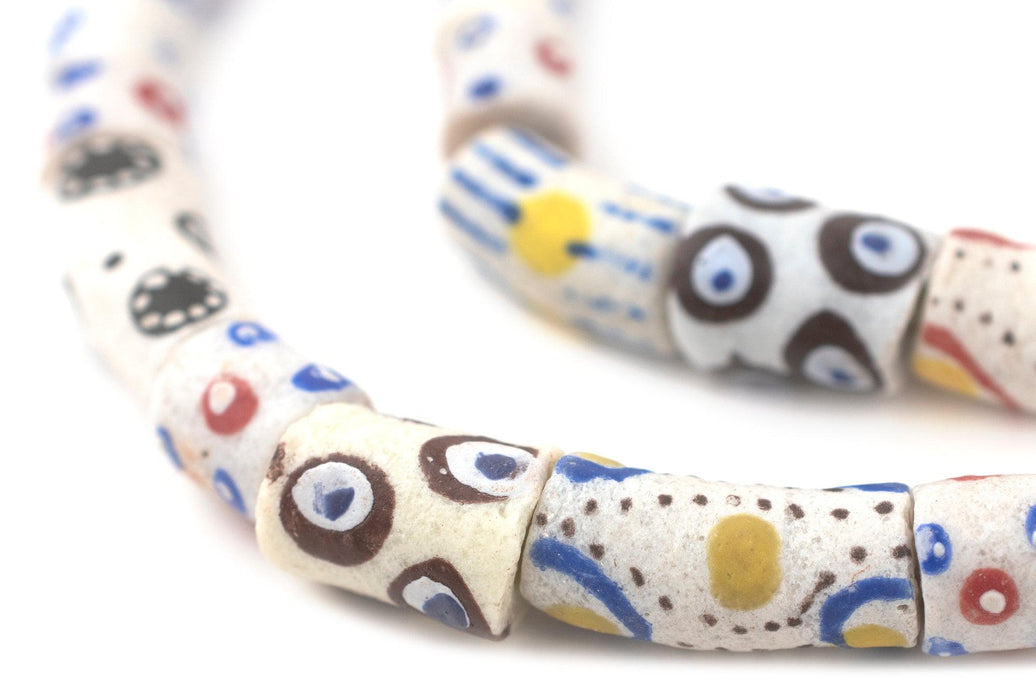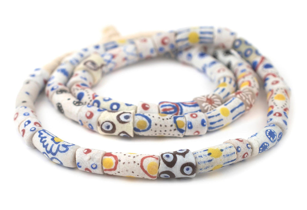 This beautiful strand of African powder glass beads was made by the people of Krobo Mountain in Ghana, West Africa. Many designs of Krobo beads are patterned to resemble old Venetian fancy trade beads. They are made from bottles and other glass items that are turned into powder, then poured into molds in order to create beads. Decorations on the beads are made with a paste made of colored glass powder and water which is applied by hand using a thin wooden stalk. The beads are cooked a second time to fix the decor. Each bead measures approximately 12-25 x 9-13mm with a hole size of approximately 3mm. You will receive a full strand measuring approximately 37".
