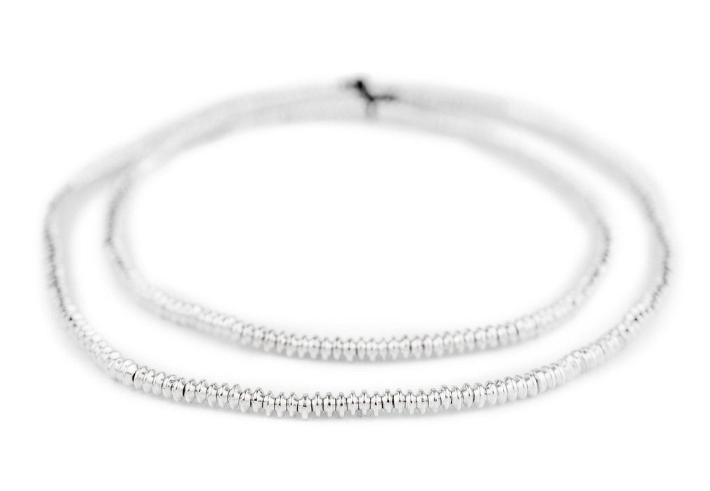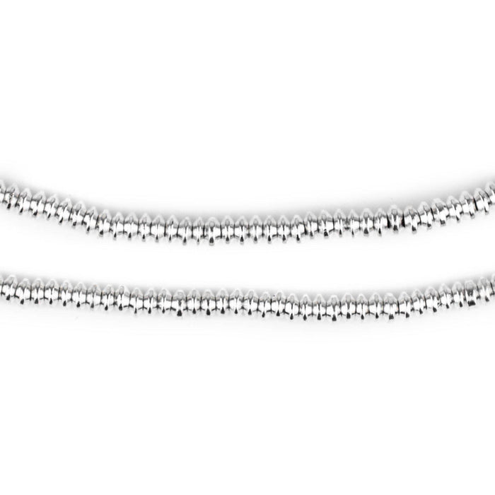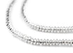 These silver saucer beads are crafted to perfection. Measuring approximately 4mm in diameter, each of these small beads is fashioned in a compressed bicone shape. They work great as spacers in your custom jewelry creations! Each strand measures approximately 24" in length, and the beads have an approximate hole size of 1.5mm. Great value!