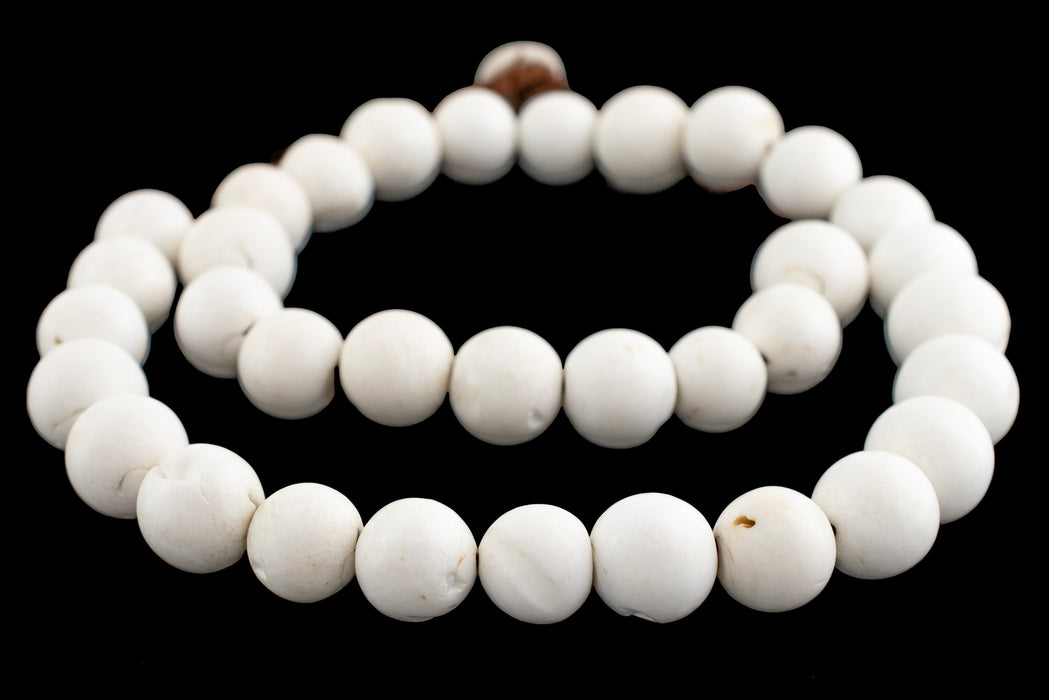 Admire the detail of these unusual beads fashioned in a round-like shape from the natural shell of the ocean conch. The material for these unique beads is said to have been traded from the Bay of Bengel north towards the Himalayan mountains. No two beads are alike however beads measure approximately 12-15 x 13-14mm with hole size of 2mm. The length of strand measures about 24". Each strand is unique and may vary slightly from photo. Beads may be used in your own special jewelry design however the beads have been nicely strung and the strand may also easily be worn as a necklace.