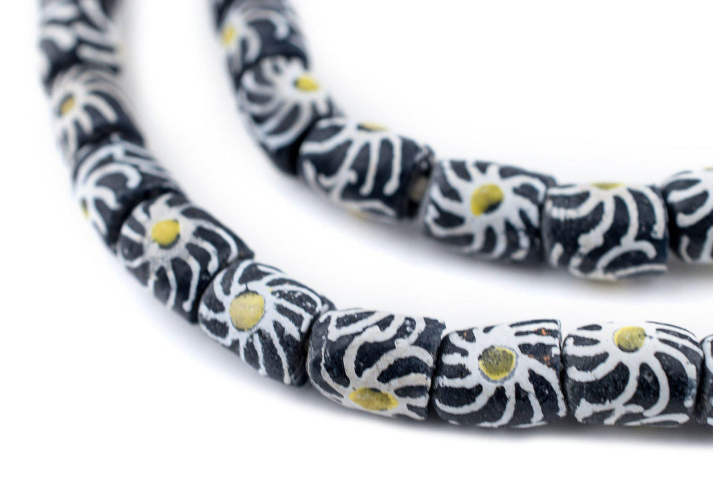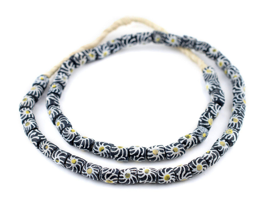 Take a look at this beautiful strand of powder glass African beads, made by the people of Krobo Mountain in Ghana, West Africa. Made from bottles and other glass items that are turned into powder, then poured into molds in order to create these cylindrical shaped beads. Decorations on the beads are made with a paste made of colored glass powder and water which is applied by hand using a thin wooden stalk. The beads are cooked a second time to fix the decor. Each bead is unique and will measure approximately 10-12 x 8-9mm. Strand may vary slightly from picture.