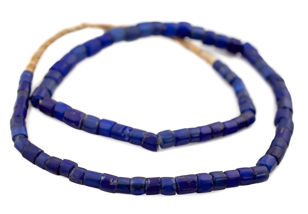 Among the most celebrated of faceted beads, Russian Blues derive their romantic name from their involvement in the Russian fur trade of the Pacific Northwest where they first appeared in the America’s during the early 1800’s. Inspired by faceted gemstone beads, the art of faceting glass was mastered by the artisans of Bohemia. There, as nowhere else in the Europe, the plentiful supply of running water supplied the energy necessary to operate the grinding wheels used to cut glass. These beads, designed for export were subsequently distributed to traders and found their way to both Africa and the Americas. Authentic Russian Blue beads such as these were produced in a number of shapes and shades, some more rare than others. Look carefully and you can see the unique quality of these hand-faceted beads apparent in the slight irregularity of the individual facets. Each bead measures approximately 6-9 x 7-10mm with about 70 beads per strand and 26-27" long including raffia. This listing is for Russian Blue beads with a more smoothed and worn surface. Strand shown is representative however each strand is unique and will vary. Please let us know in advance if you have specific requirements. Don’t miss your chance to own this special piece of history today!