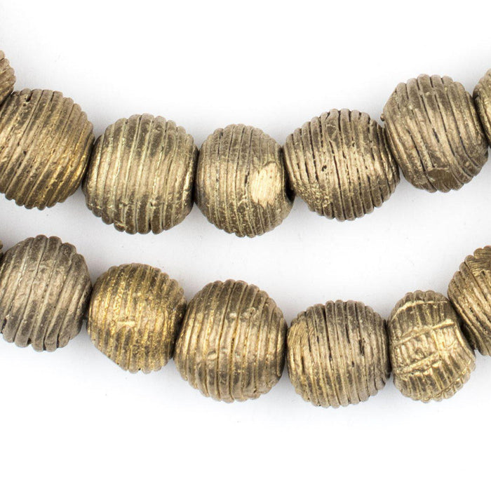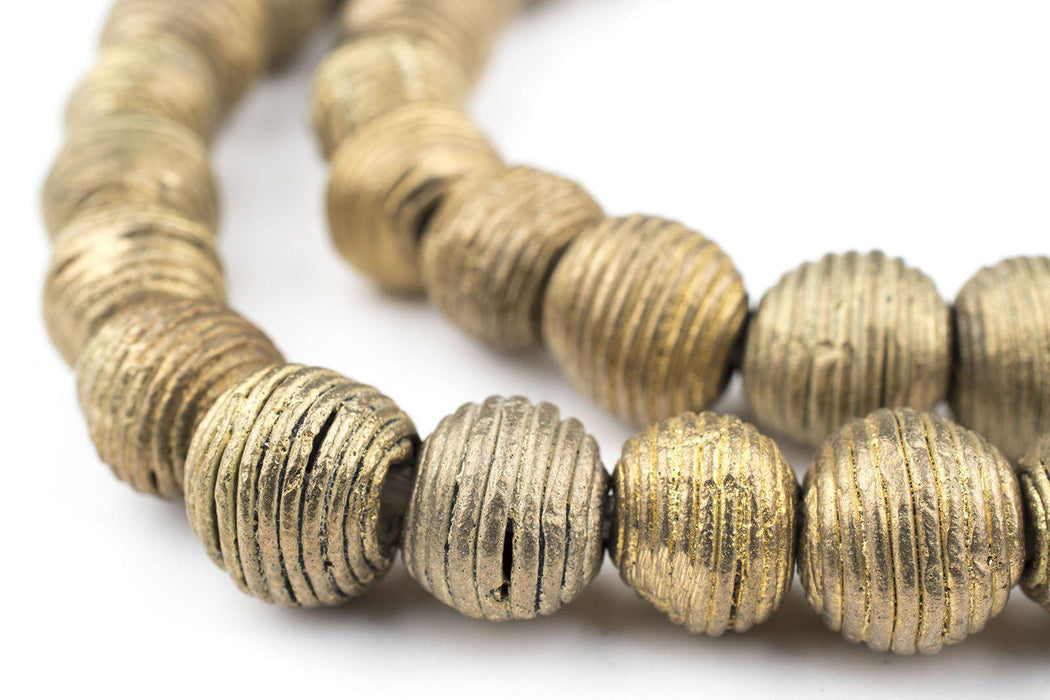 Take a look at these Brass "Globe" trade beads from Africa. Each bead is made individually through the "Lost Wax process" technique. The strand is approximately 26", with beads measuring approximately 12-14mm in diameter. Beads may show some imperfections because they are hand made and some strands may have more porous beads than that strand shown. Each strand is unique and pattern may differ slightly from photo.
