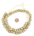Take a look at these round-shaped Ghana Brass Trade Beads from Africa. Each bead is made individually through the "Lost Wax process" technique. This strand is about 26", with beads measuring approximately 9-11 x 11-13mm. Each strand may have 1-2 beads that are less than perfect and may vary slightly from strand pictured. Shade of brass can vary and may have be slightly more copper-toned for some strands.