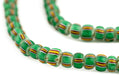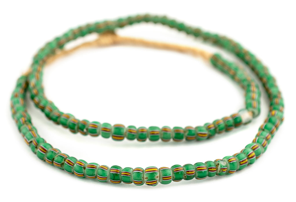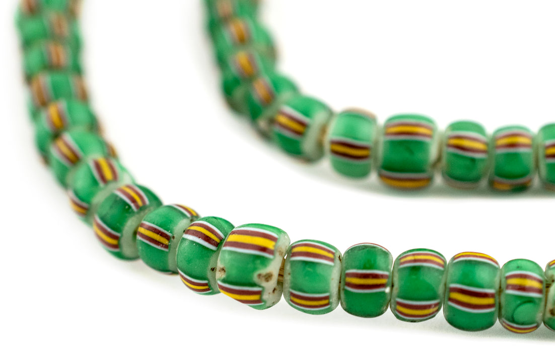 The distinctive pattern of these watermelon chevron beads is bright and cheerful. This unusual variety of chevron beads has a unique pattern. Old Trade Beads such as these are becoming increasingly difficult to find. This particular strand has been nicely strung on raffia in a traditional fashion. Individual beads measure 4-6 x 6-8mm with a strand length of 24". Only one available.