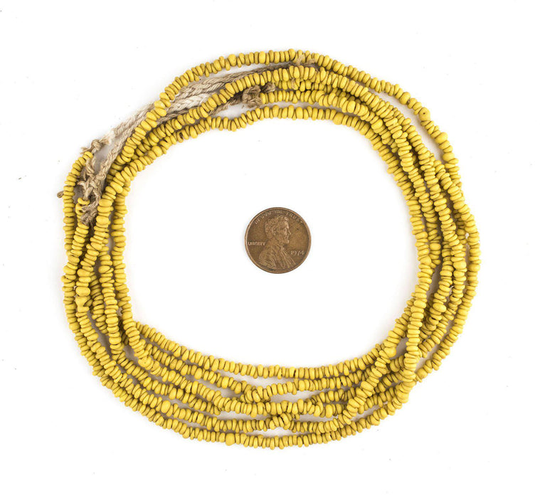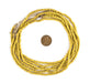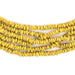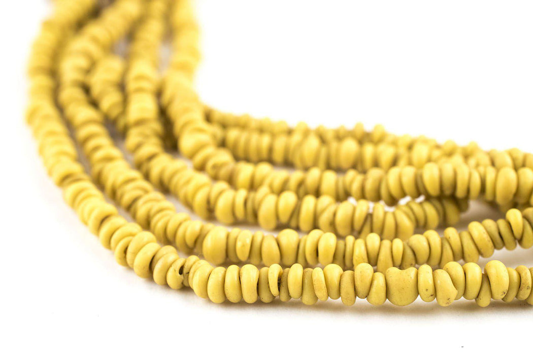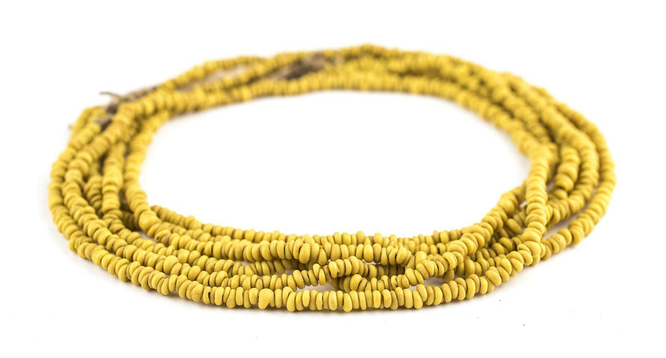 These yellow java glass heishi beads are handmade by independent artisans on the island of Java. Pay close attention and you will notice a very special heishi shape, coupled with a beautiful texture. These beads are perfect to use as in your ethnic jewelry designs. These beads measure approximately 1 x 3-4mm, with a hole size of 2mm. Each strand measures approximately 23 inches in length. Multiple strands pictured. Each strand sold individually. Great quality at a wholesale value! Tone of yellow may vary slightly from strand to strand.
