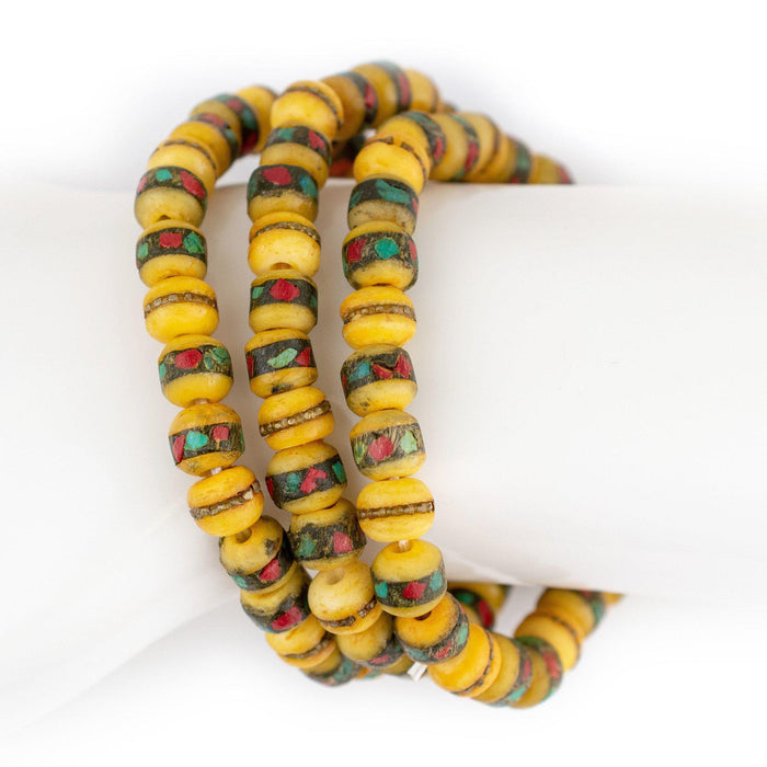 Malas are traditionally used in Buddhist culture as a part of the practice of meditation, however, today malas are enjoyed by people around the world looking to gain mental clarity and live in the present. Our collection of mala bracelets are handmade in Nepal using traditional inlaid beads. These beads are hand carved, inlaid with coral and turquoise style pieces, and strung 27 beads per 7.5 inch bracelet. Available in over 15 colors, choose your favorites to build your own unique stack! Beads may also be repurposed into your own unique jewelry designs. Multiple bracelets may be pictured, however each bracelet is sold individually. Shade may vary slightly from photo.