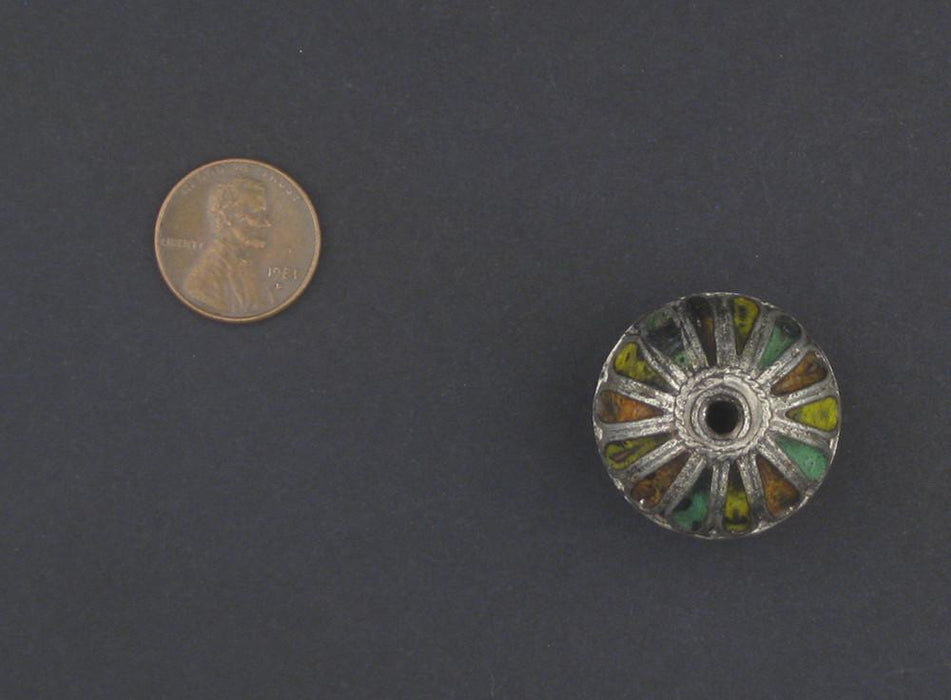 Simple but elegant, this multicolor enameled Berber pendant bead would add an attractive touch to your creative jewelry. Each bead is handcrafted and individually decorated. It measures 27mm in diameter by 25mm wide.