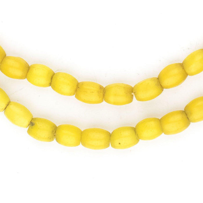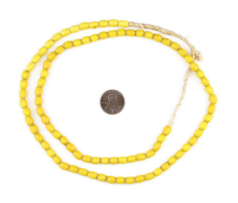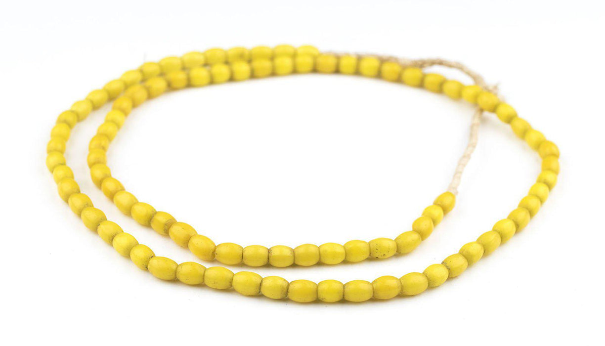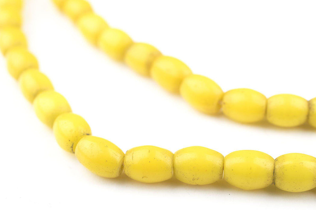 These vintage yellow glass beads were originally produced in Czechoslovakia and sent to West Africa in the mid-20th century. Crafted in an oval shape, similar to the grain of rice, they are often referred to as "rice beads." Due to their vintage nature, they are becoming increasingly difficult to find. Each bead measures approximately 7 x 5mm with a hole size of 1mm. Strands measure approximately 25-29". Limited supply available. Get yours today!
