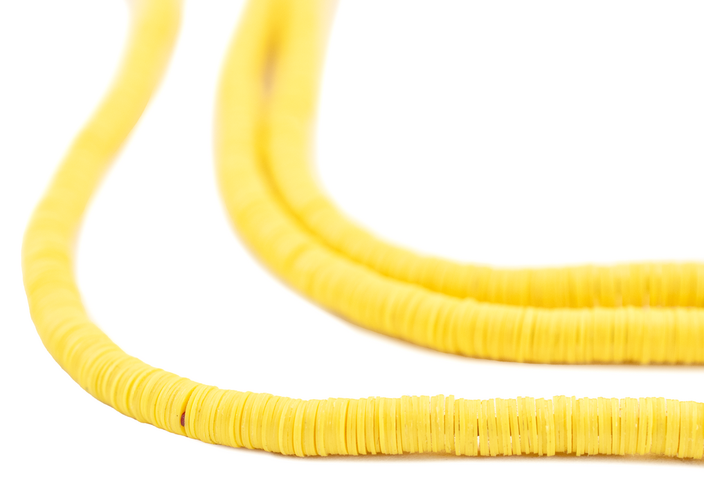 Take a look at this unusual strand of yellow color African Phono Record beads. The strand measures 31" long with beads measuring 4mm in diameter. Each strand is unique and may show some variability in smoothness of beads compared to photo.