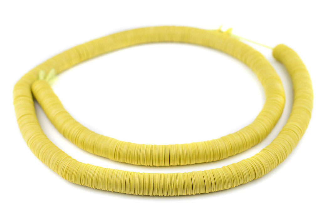 Take a look at this fun and vibrant strand of Yellow Vinyl Beads! These beads are eco-friendly and handmade out of recycled Phono Records. Beads like this are popularly worn as waist chains in places like Ghana and Nigeria. Every strand is approximately 35" in length. Each bead is about 1 x 14mm with a roughly 1mm hole. Shade of yellow may vary slightly from photo. Brighten up your designs and grab a strand or two for yourself today!