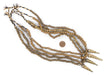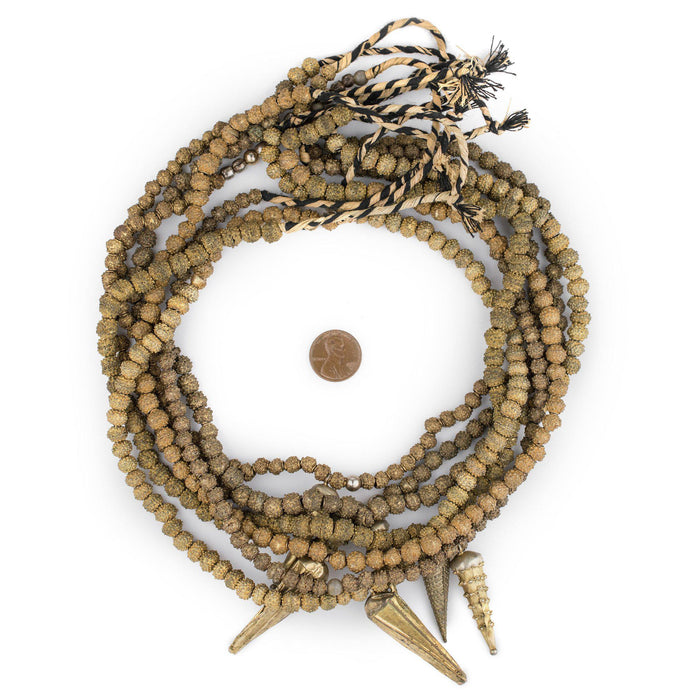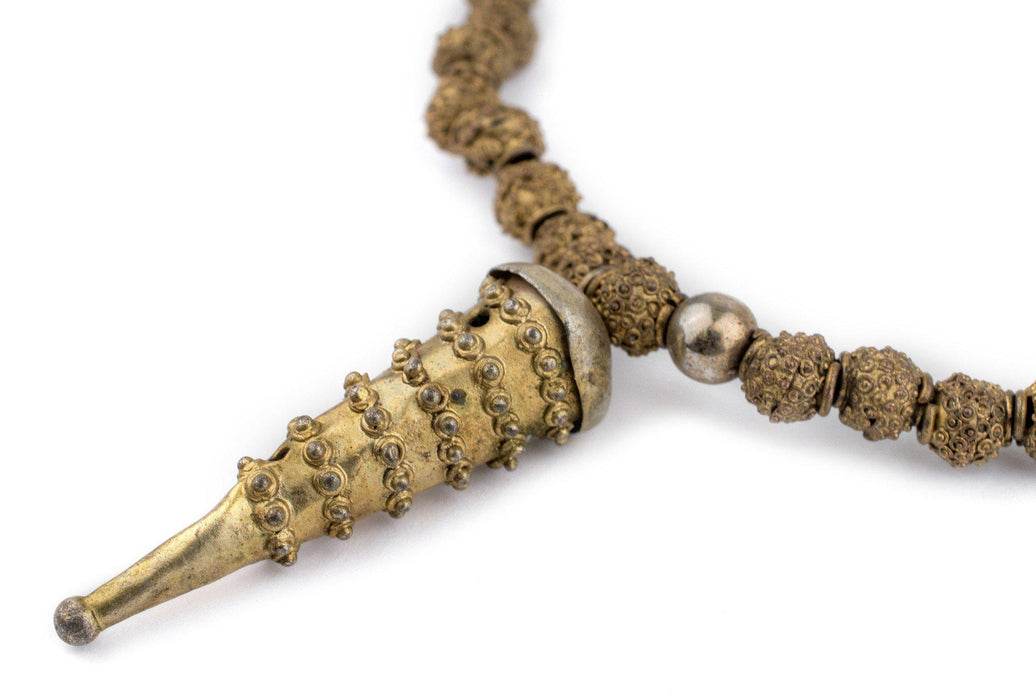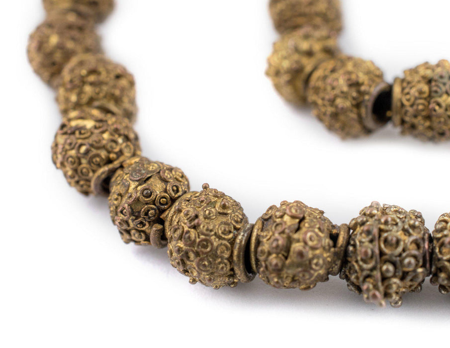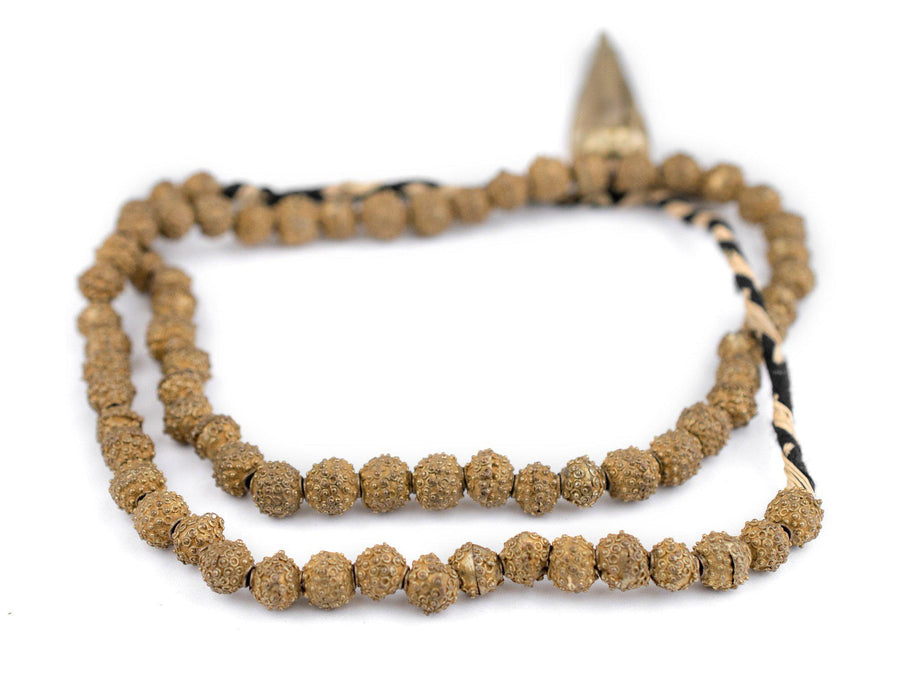 These Vintage Yoruba brass beads have a unique and whimsical shape. Formed with a patterned surface, these hollow beads are distinctive in their design. The Yoruba people are one of the predominant ethnic groups in Nigeria. Each strand will include approximately 80 rounded brass beads measure 6-8mm in diameter. The bead count can vary depending on the size of the bead. Product photo showing multiple strands is intended to illustrate variation in shape of beads and design of the pendant. Please inquire in advance if you have specific needs. A few beads may be broken or damaged due to age. Limited supply.
